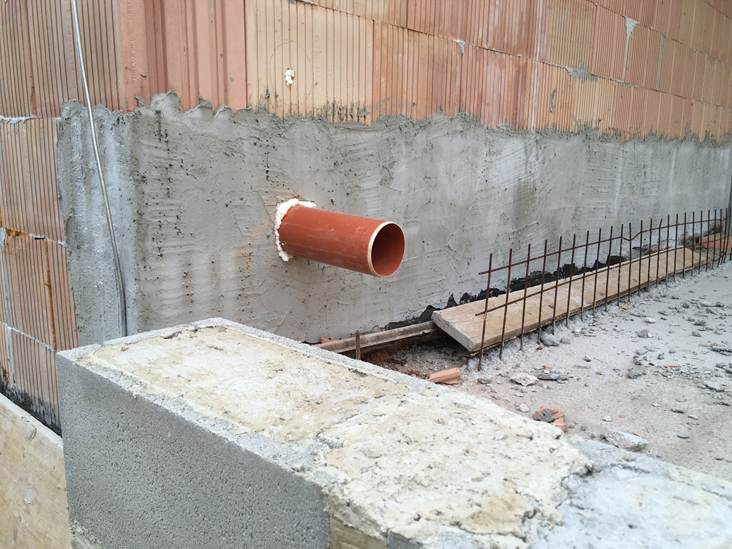Regenrohraustritt Ostseite Erdgeschoss durch Außenwand